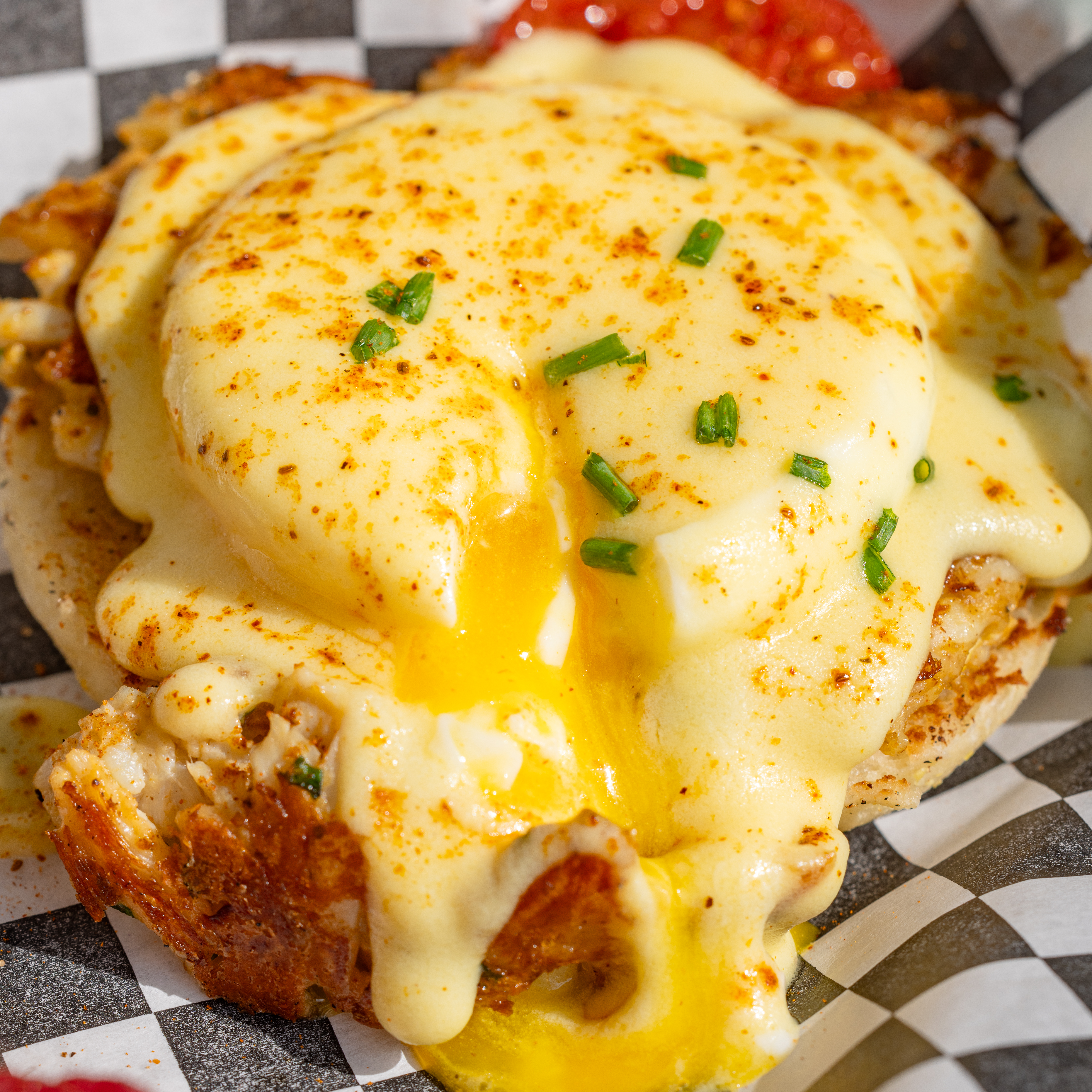 A poached egg with miniature crabcake laid atop a Texas French bread crumpet, finished with hollandaise and chives. Comes with a side of fruit!